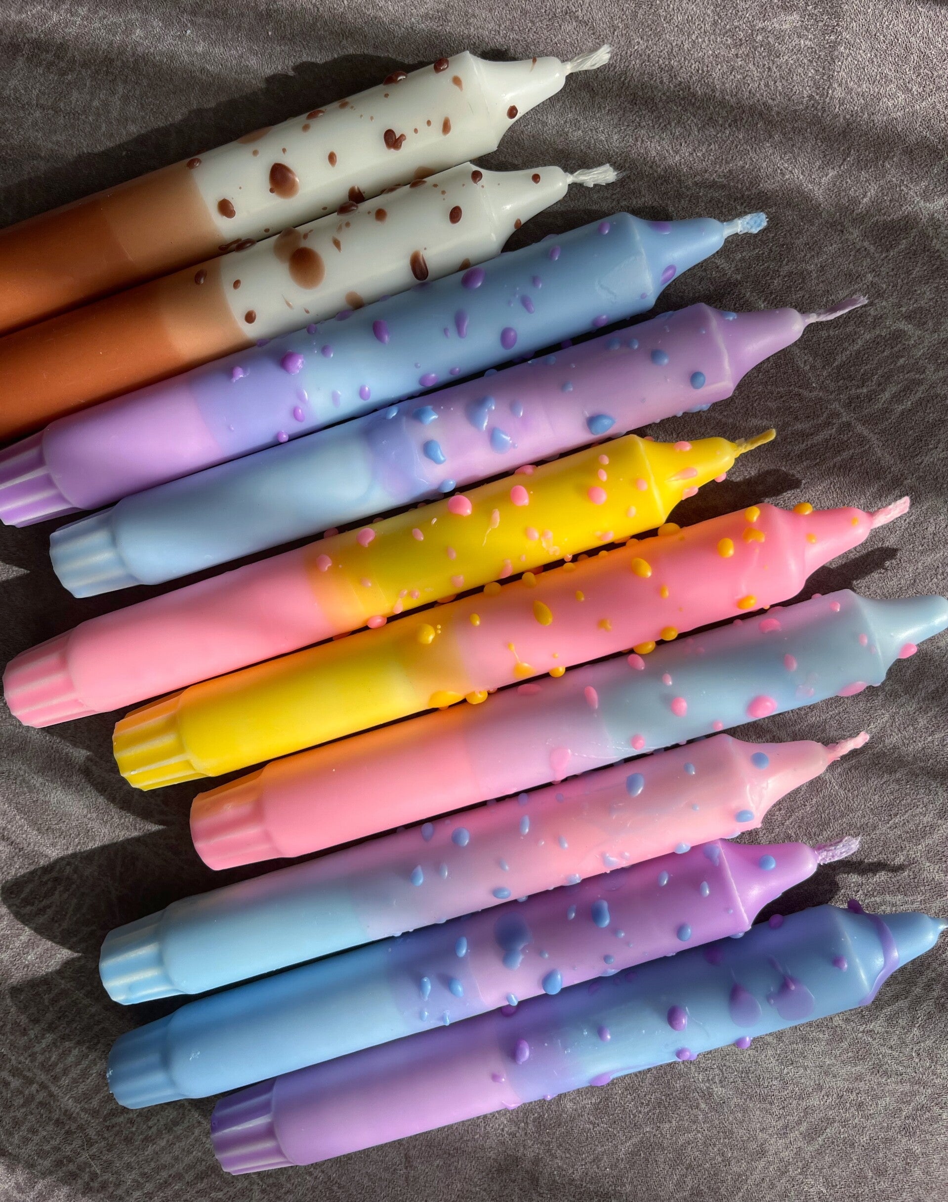 Het is belangrijk om kaarsen op de juiste manier op te slaan om te voorkomen dat ze smelten of vervormen. Bewaar kaarsen op een koele, droge plaats, uit de buurt van direct zonlicht en warmtebronnen. Elke kaars is met de hand gegoten en gekleurd. Kleine variaties in kleurintensiteit of natuurlijke verkleuring na verloop van tijd zijn onderdeel van het handgemaakte karakter van ons product.